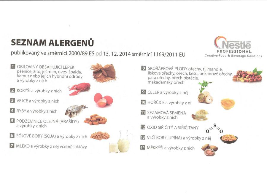 Od 13.12.2014 směrnicí 1169/2011 EU se musí na jídelníčku uvádět seznam alergenů. Na jídelníčku jsou uvedena pouze čísla těchto alergenů.
